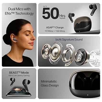 The hypothetical boAt Airdopes Plus 311 (2025 Launch) in Charcoal Black, with its revolutionary glass design, dual mics with ENx, fast charge capability, 50 hours of battery life, low latency, and IPX4 rating, represents a compelling vision for the future of personal audio. It's a product that doesn't just meet current expectations but anticipates and exceeds them, setting new benchmarks for design, performance, and user experience in the fiercely competitive TWS market.